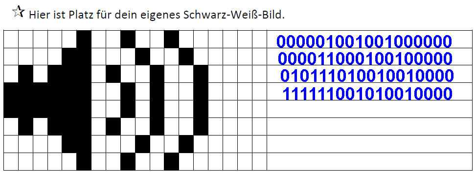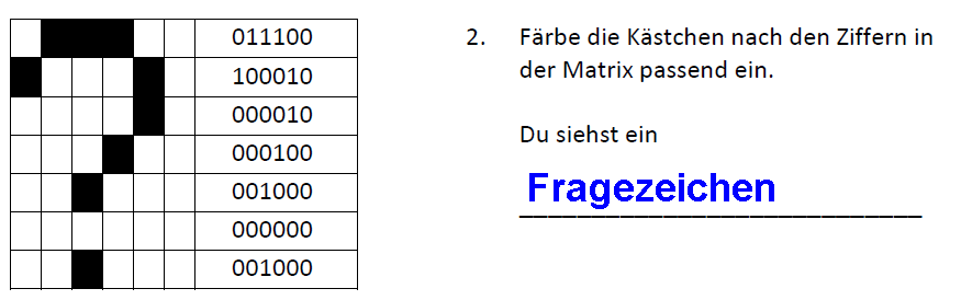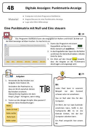 Auch die Anzeige auf dem Bildschirm des Computers besteht – mit einer starken Lupe oder dem Mini-Mikroskop betrachtet – aus vielen Einzelpunkten, die man Pixel nennt. Jedes Zeichen wird, wie an anderen Stationen gelernt, im Computer durch seinen ASCII-Code aus 8 Bit repräsentiert. Zur Darstellung auf dem Bildschirm oder mit einer Anzeigetafel muss eine weitere Codierung für das jeweils spezielle Gerät erfolgen.