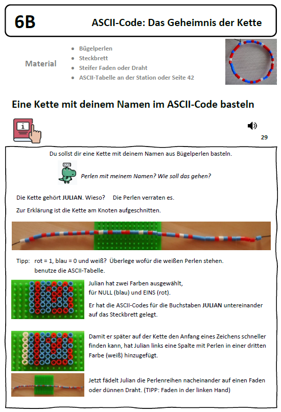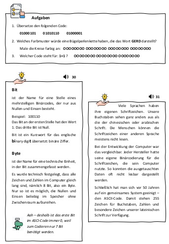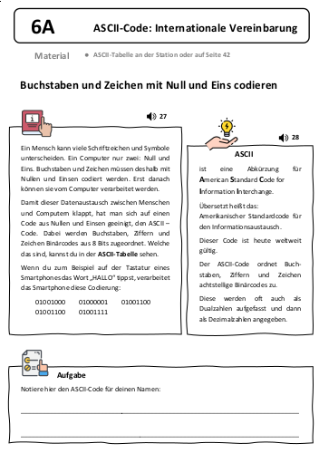 Es ist sinnvoll, die ASCII-Tabelle auf Seite 42 des Forscherheftes zu nutzen. Es lohnt sich, einige Exemplare für die individuelle Nutzung durch Schüler:innen bereit zu halten. Diese verkürzte Tabelle enthält nur die binären Codierungen für die großen Buchstaben, Ziffern und wichtigsten Sonderzeichen.