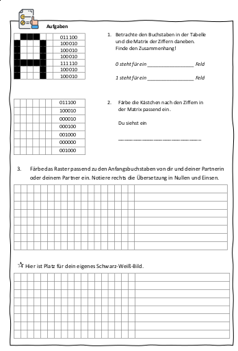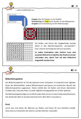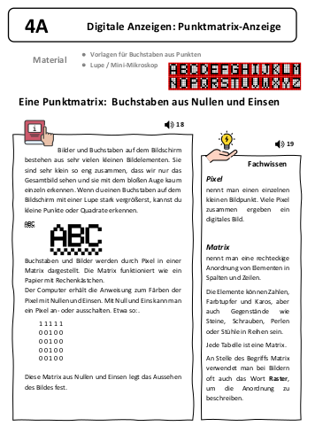 Auch die Anzeige auf dem Bildschirm des Computers besteht – mit einer starken Lupe oder dem Mini-Mikroskop betrachtet – aus vielen Einzelpunkten, die man Pixel nennt. Jedes Zeichen wird, wie an anderen Stationen gelernt, im Computer durch seinen ASCII-Code aus 8 Bit repräsentiert. Zur Darstellung auf dem Bildschirm oder mit einer Anzeigetafel muss eine weitere Codierung für das jeweils spezielle Gerät erfolgen.