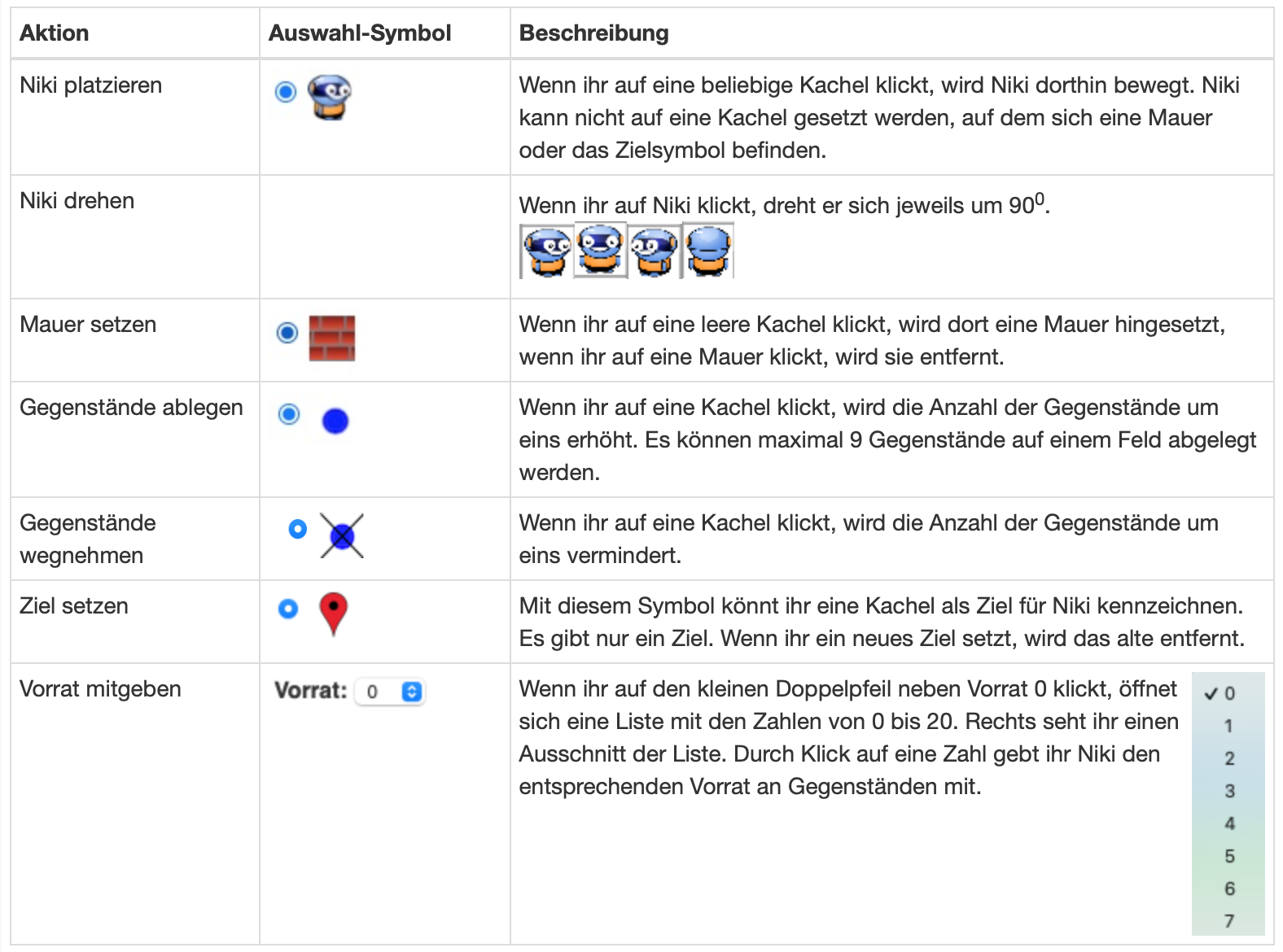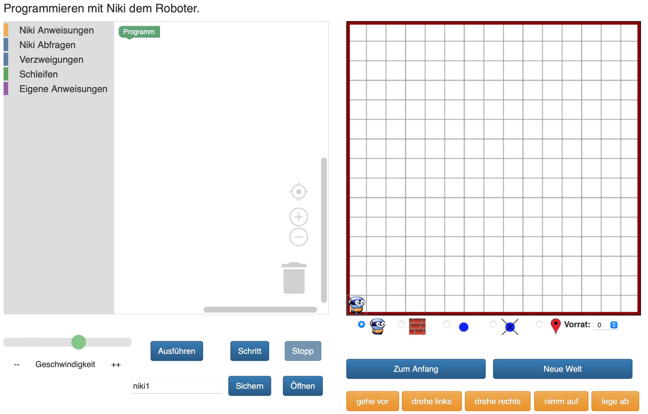 Nachdem du die Welt gestaltet hast, kann der NIKI mit den nur 5 zur Verfügung stehenden Befehlen und einem Minimum an Kontrollstrukturen schon sehr schwierige Aufgaben lösen.